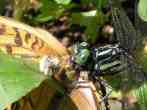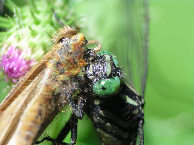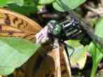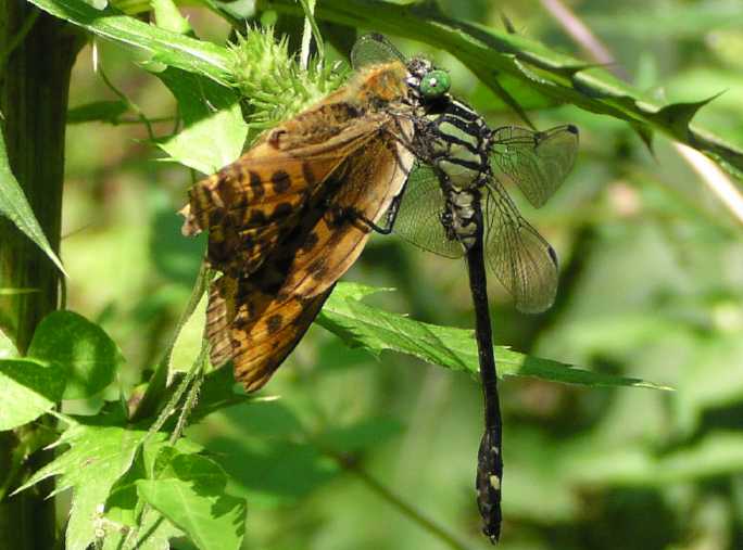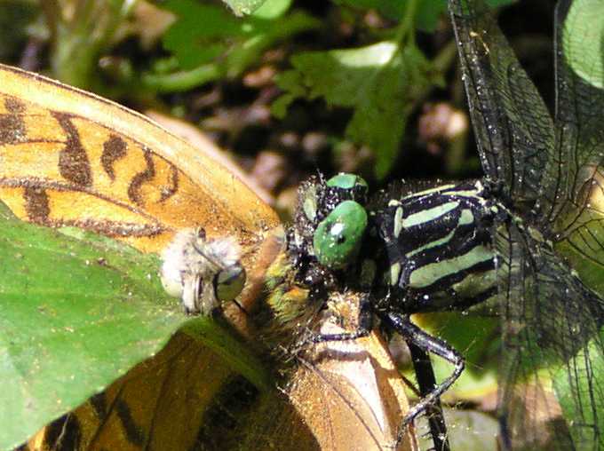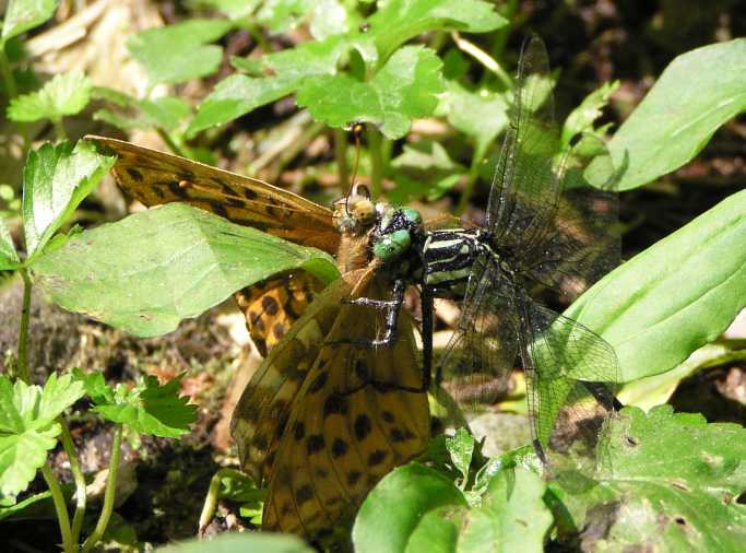| ぱっと飛び立って直ぐです。バタバタというかガサガサというか、翅を打ち付けこすり合うような音が聞こえてきました。思わず音のする方に目をやると、ミヤマサナエがミドリヒョウモンの顎の下に食らいついていました。ミドリヒョウモンは前翅長4センチほどの大型のヒョウモン類で、ミヤマサナエより大きいかも知れません。 |