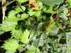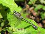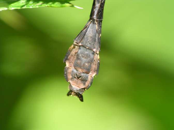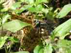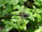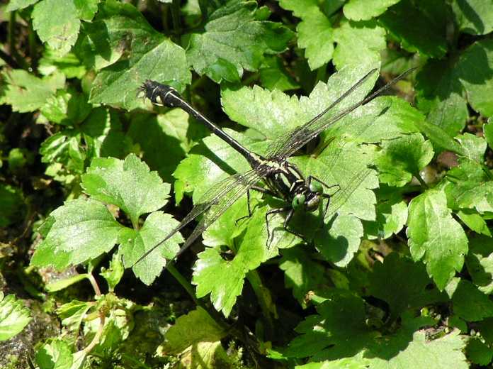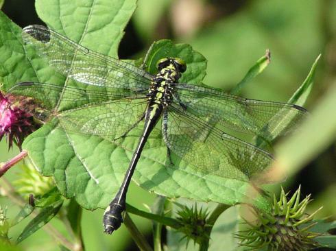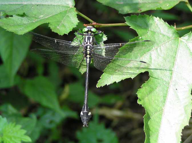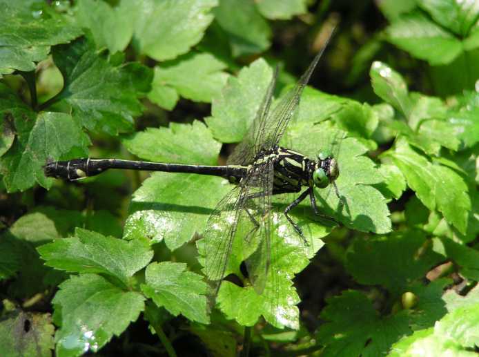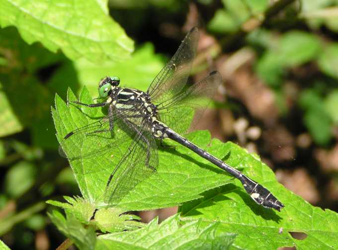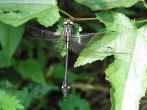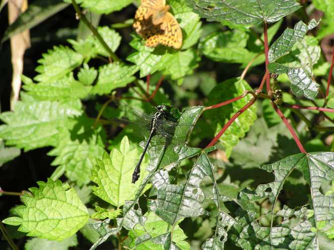 これは2005年9月18日の出来事です。前日塩那スカイラインでミヤマサナエを見かけ写真を撮ったのですが、あまりよい写りではありませんでした。そこで例年見かけている場所(木綿畑新田)へ行ってみることにしました。草の生い茂った山道を進み車を止めると、薄暗い道の先に蝶が飛んでいるのが見えました。ミドリヒョウモンとオオウラギンスジヒョウモンでした。写真を撮っていて、ふと横に目を移すと昨日撮り損ねたミヤマサナエがいました。ミヤマサナエは4センチ程の大きさで意外と小さいのです。何枚も写真を撮りました。初めの場所から2度場所を変えて留まりました。そしてそのたびにまた写真を撮りました。 その時です。 |
