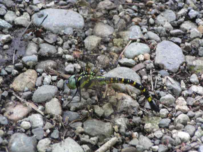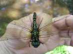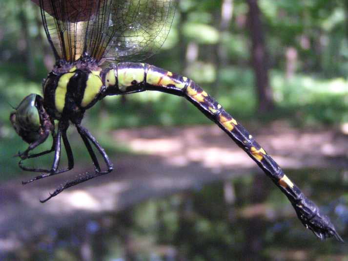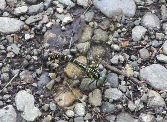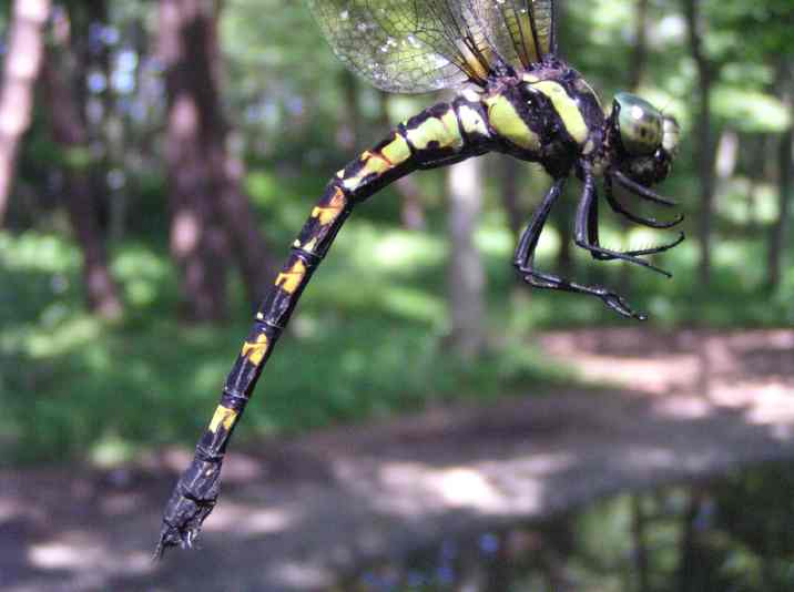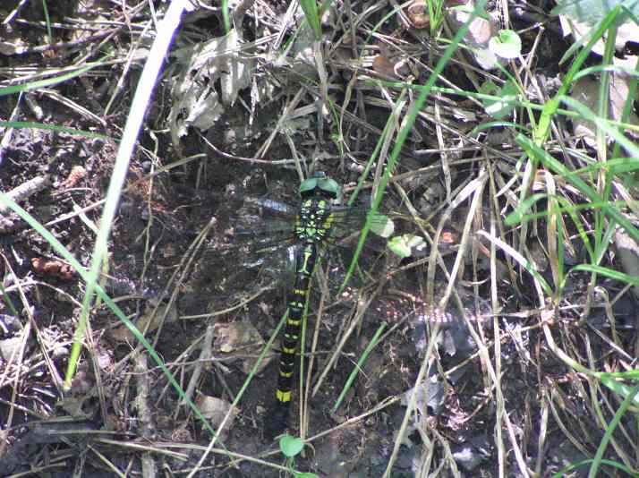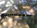 | 7月27日の夕方、オオムラサキの写真を撮ろうと数カ所のポイントを巡回していたところ、小さな水溜まりから飛び立つトンボを見つけました。ちらっと見えた腹部の模様で、今まで見たことのないトンボだと気づきました。直ぐ飛び去ってしまって戻ってきませんでした。というわけで28日、今日再び現地に行き、撮影に成功しました。あちこちの泥状になっている地面や水溜まりの近くに産卵しているところです。うまく撮影できなかったので素手で捕まえて(産卵中だったのでとても簡単に)撮影してみました。「レッドデータとちぎ」によると絶滅危惧類(Bランク)に指定されています。 |