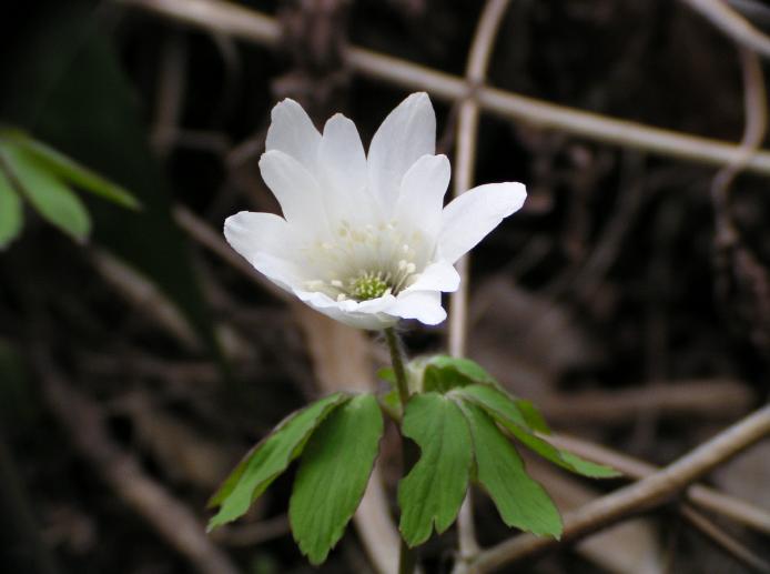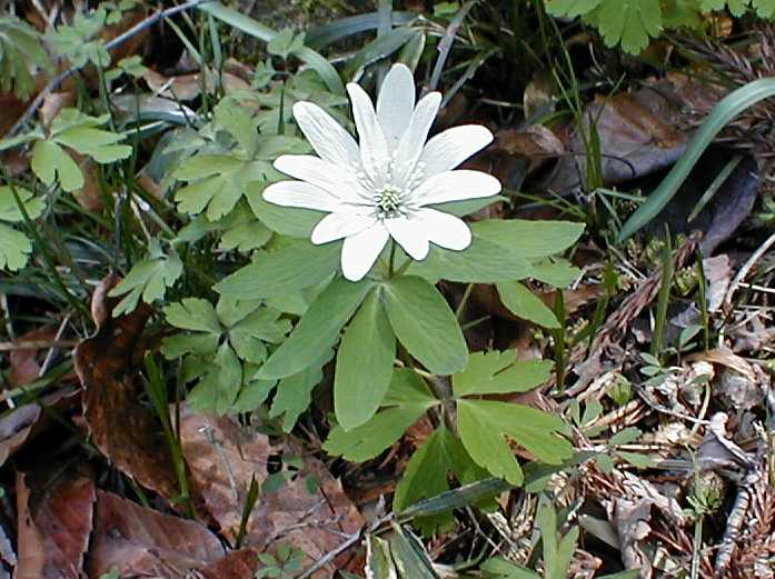 群生しているキクザキイチゲの中に、キクザキイチゲとはちょっと違った葉をしているものが目に付きました。花はそっくりなのにと思い、写真を撮って調べてみるとアズマイチゲだと分かりました。