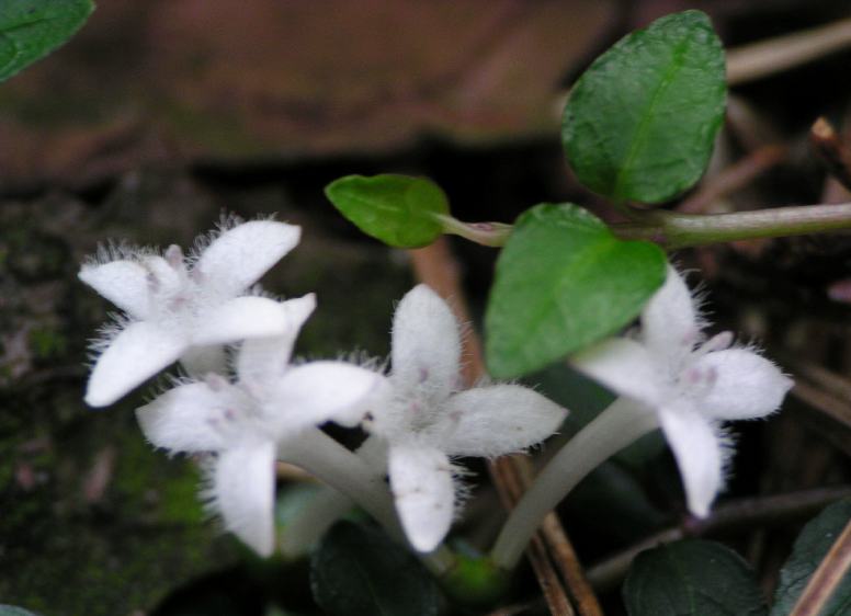 ツルアリドオシのデータ 1.分布 北海道〜九州 2.生育地 低山〜亜高山の林内 3.特徴 花期 6月〜7月 環境省カテゴリー :指定なし レッドデータとちぎ:指定なし 山梨で絶滅危惧I類、埼玉で絶滅危惧II類に指定されています。 花は2個並んで咲くが、子房がくっついて1つの赤い実になる。 実の頂きには2つの花の跡が残っている。 |